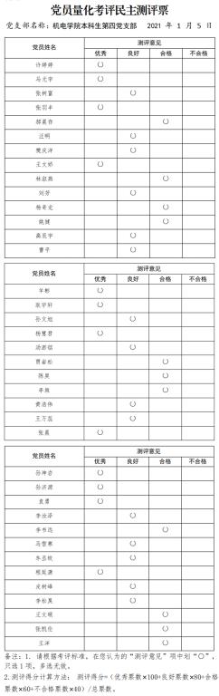 根据《中共BBIN宝盈集团委员会党员量化考评指导办法(试行)》要求,2021年1月5日,BBIN宝盈集团本科生第四党支部按照文件要求进行了民主评议党员,现将评议结果公示如下: