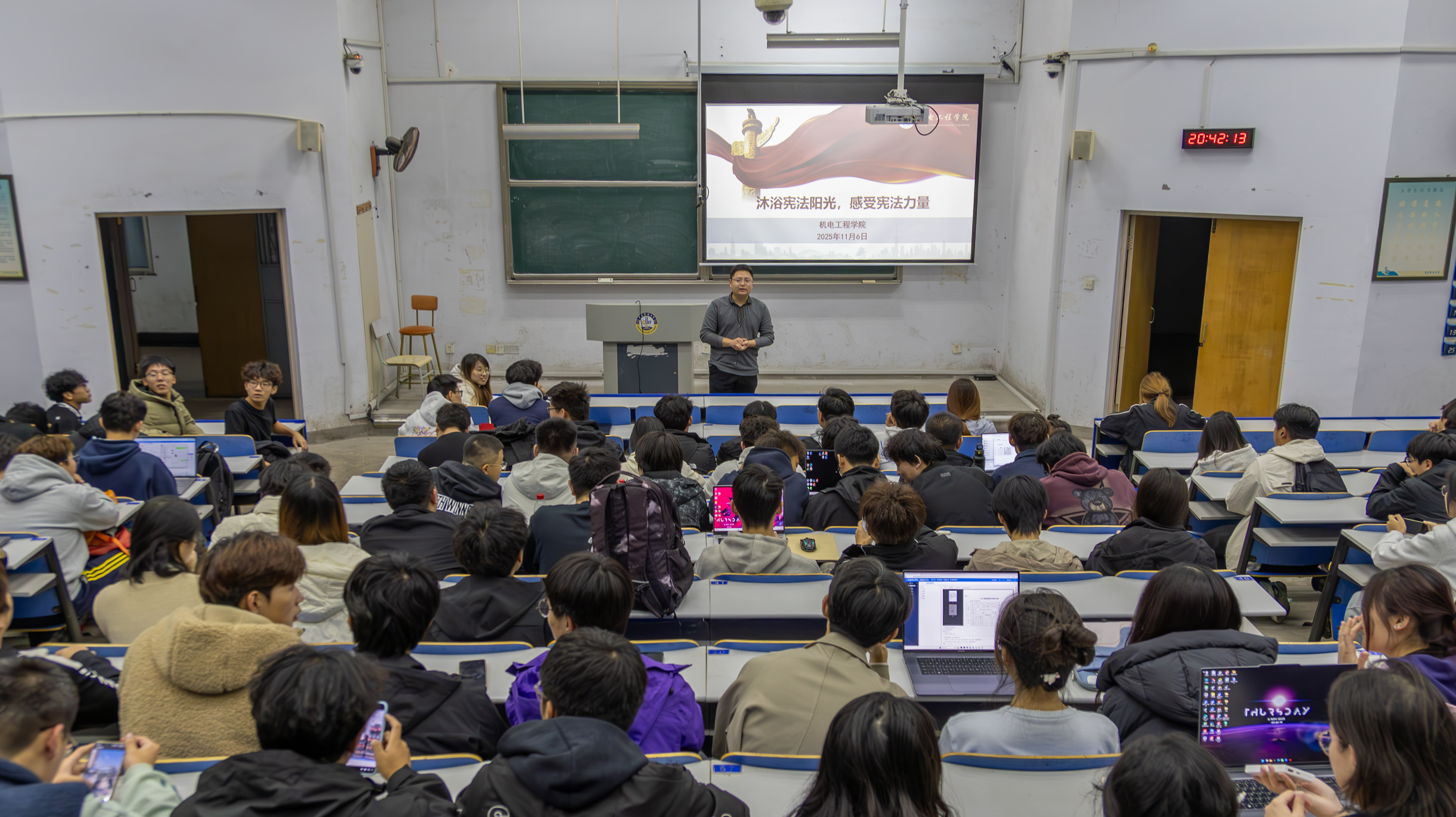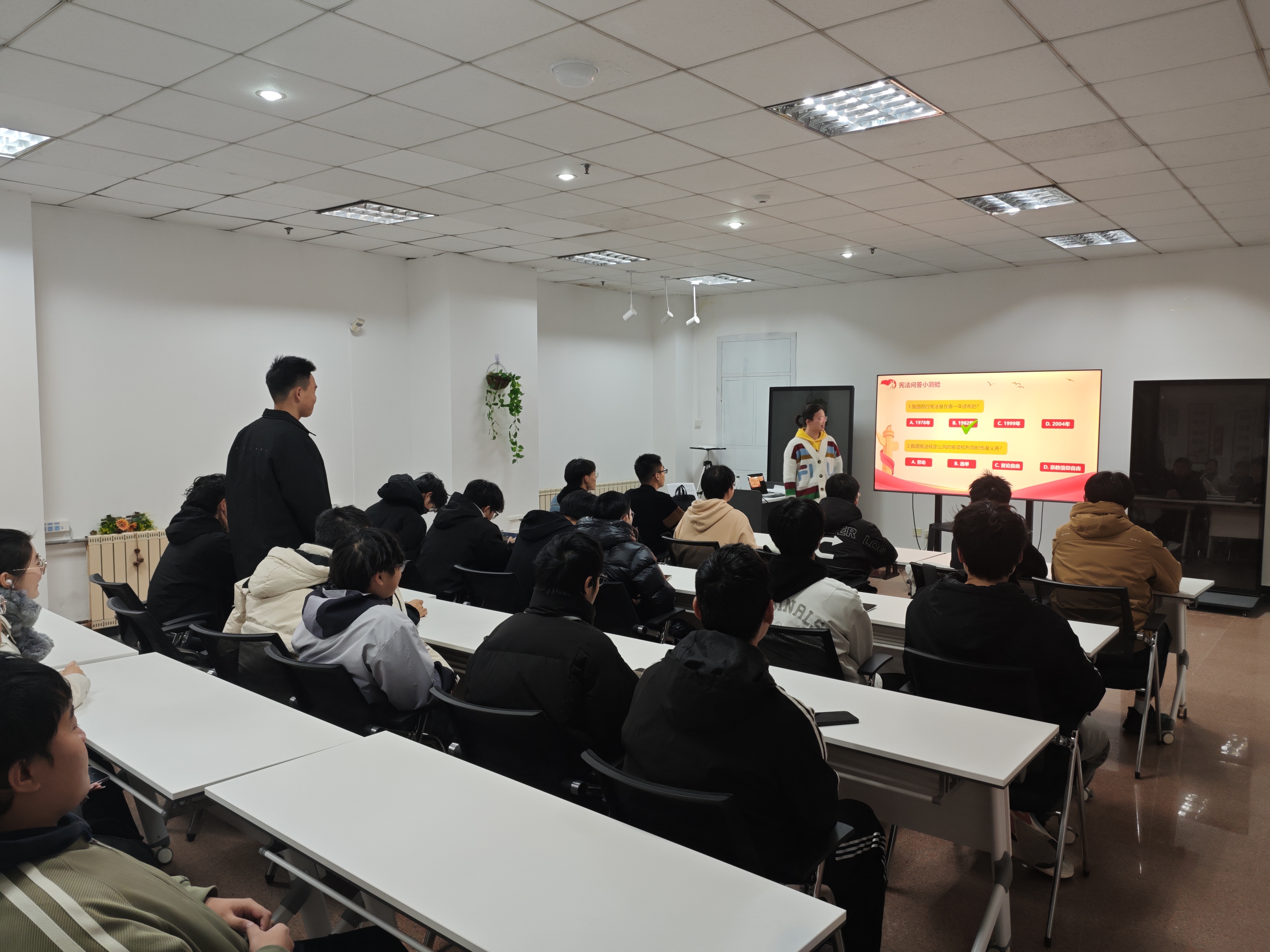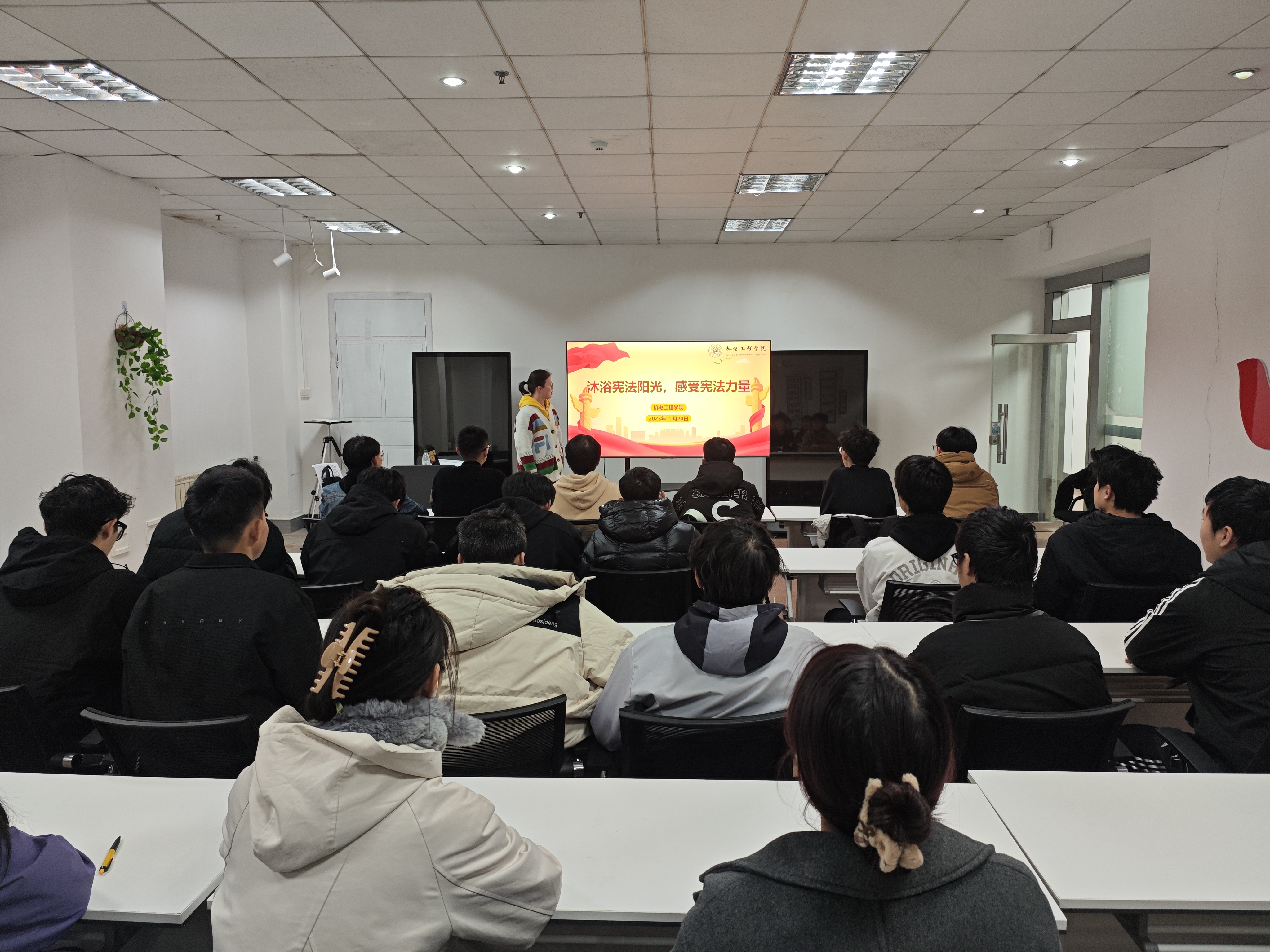 学院在机电楼D3-530举办专题宪法讲座,主讲教师用通俗、生动的讲解,为学生构建清晰完整的法治认知体系。与此同时,各年级辅导员深入班级,通过宪法知识竞赛、小课堂微互动、同唱宪法歌曲等形式,增强课堂参与度和体验感,让抽象的法律条文以可视、可感的方式“活”起来,使法治教育真正做到润物无声。